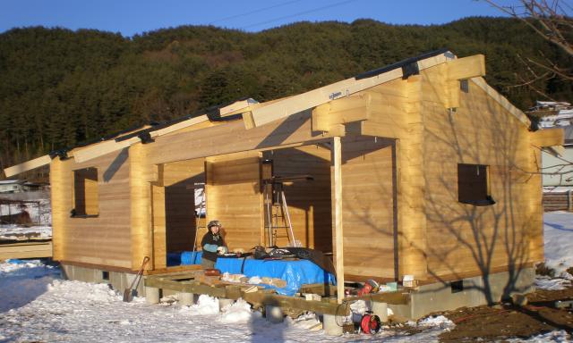 This is how we left things at the end of day on Sunday. Not too much visible progress, but we're happy to have the problematic rafters (those requiring spacers) up and fixed in place.