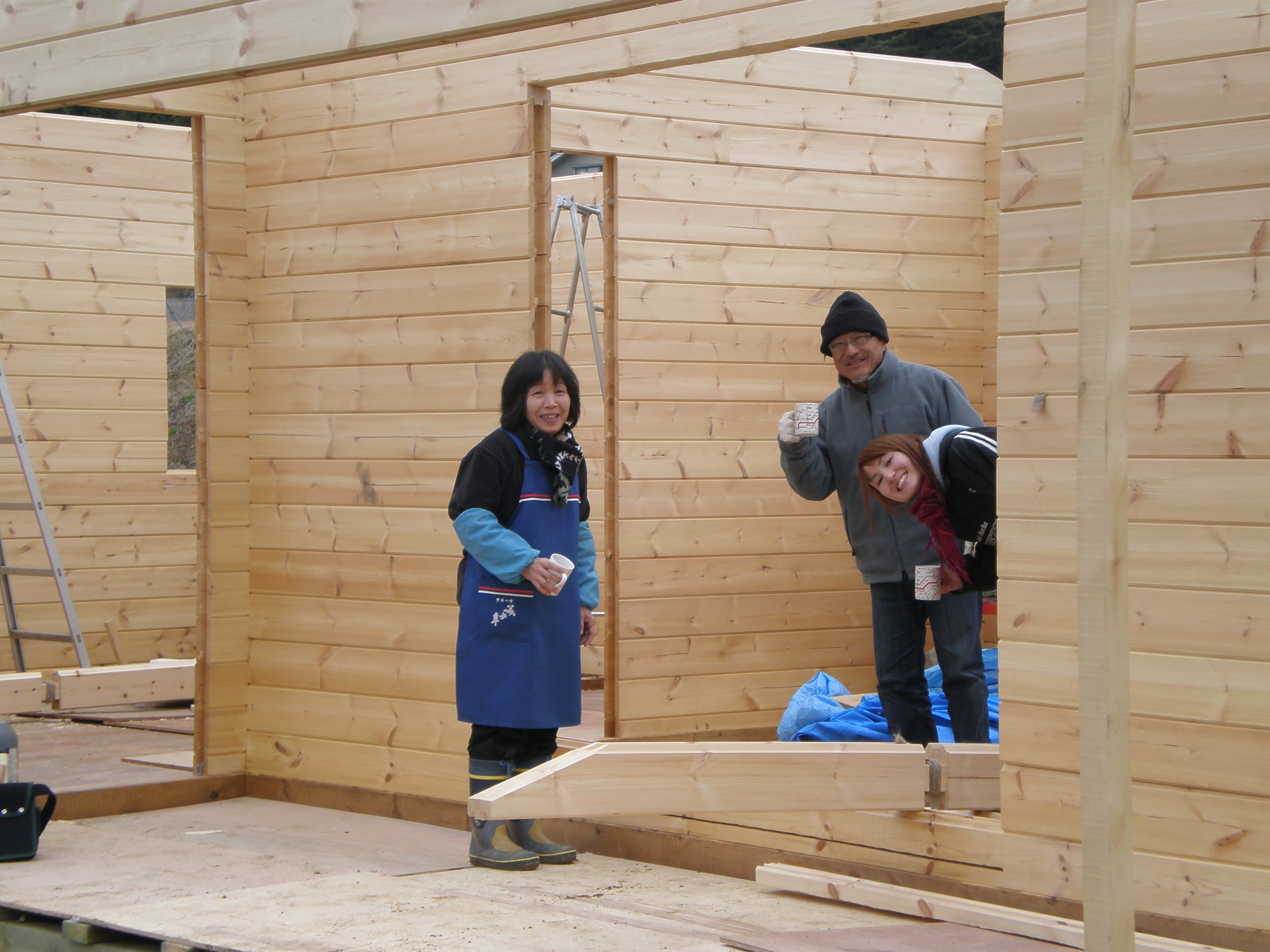 Note the "C" wall log lying on the floor, ready for installation. If you look closely, you can see the insulation already wrapped round the joint.