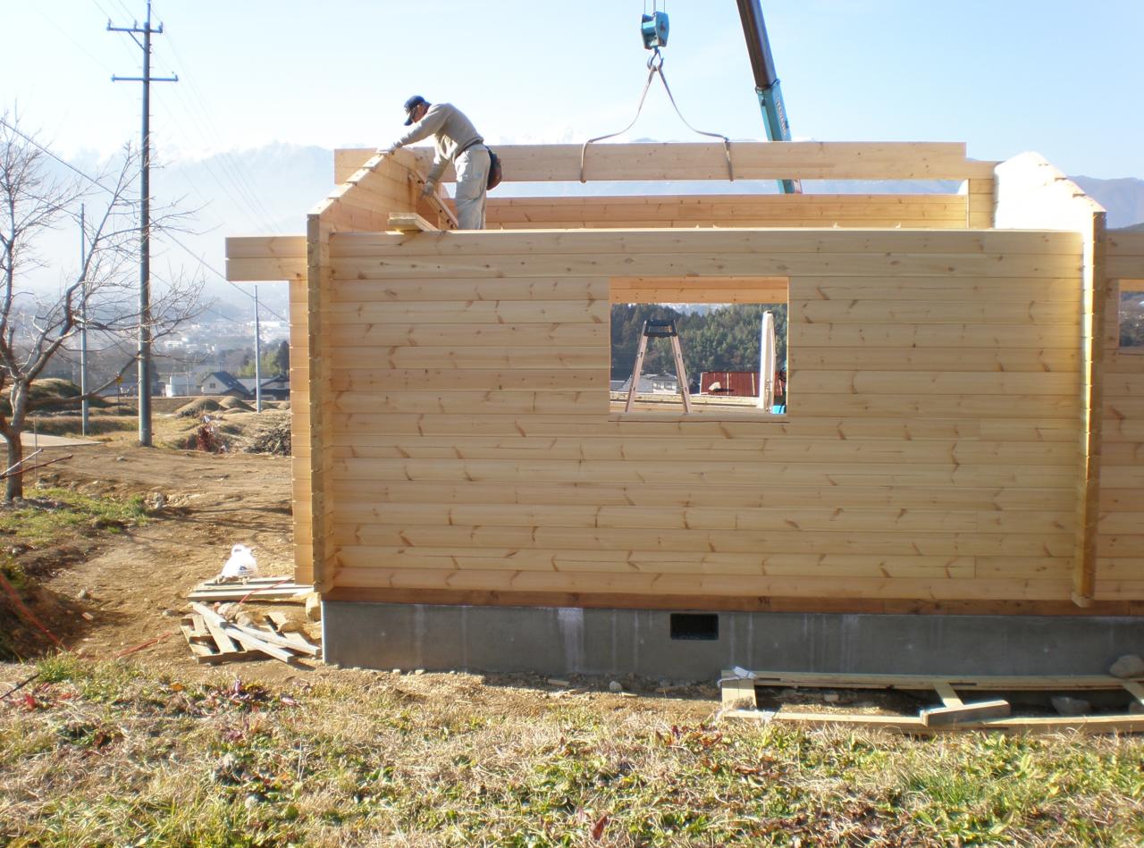Tanaka-san (Logtech) fitting one of the side logs after one half of the main roof truss had been lifted into place. He also cut the "L" joints and