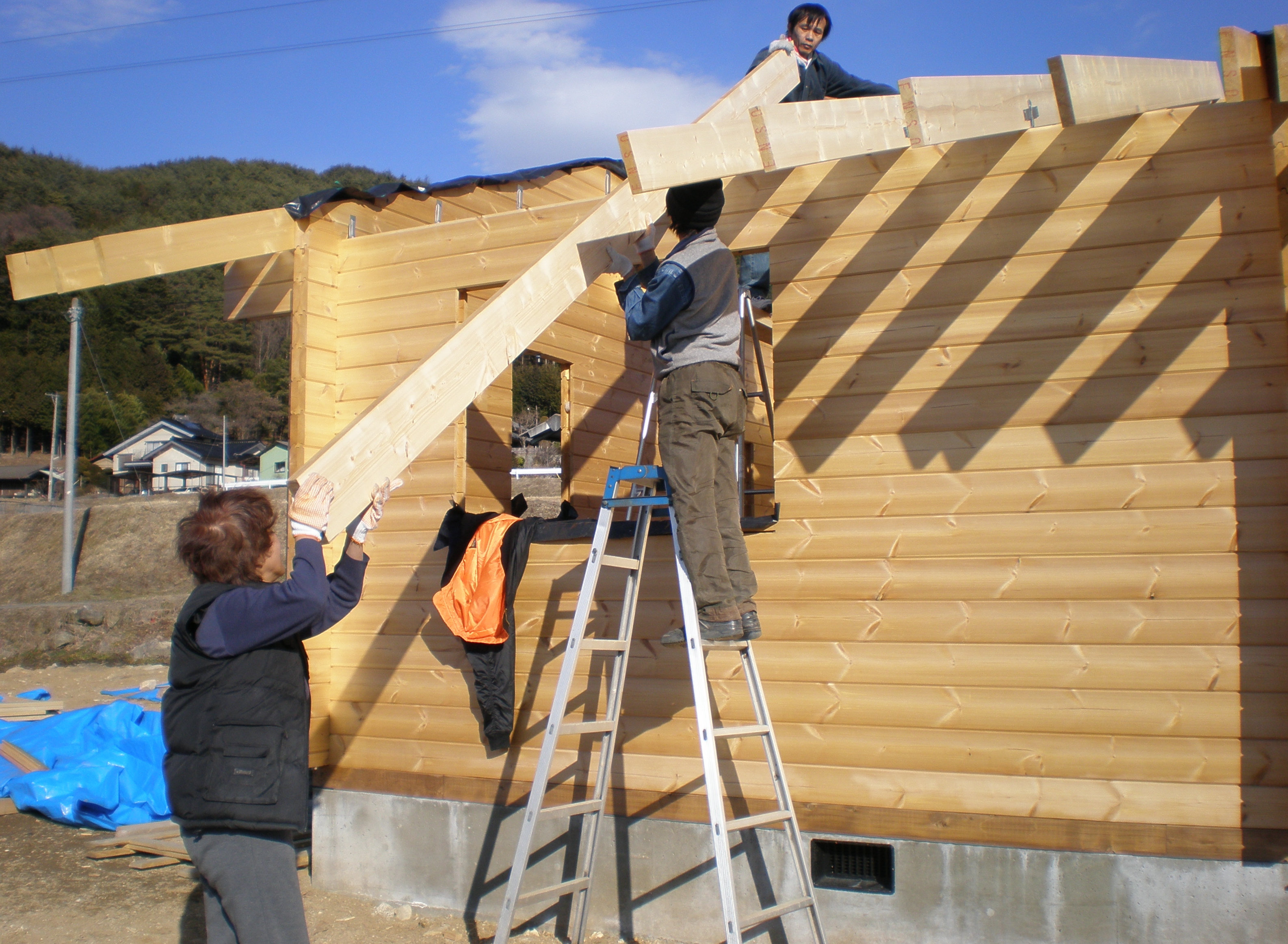 The team continued on into the afternoon putting up the North-side (bedroom and bathroom area) rafters. Koike-san was the main force on the ground, keeping us supplied with cut rafters and fitting sliders on the wall ends. Eto-san (wife) was helping him lift the rafters up to wall-top level, with Eto-san (husband) receiving on the top, main-beam level.