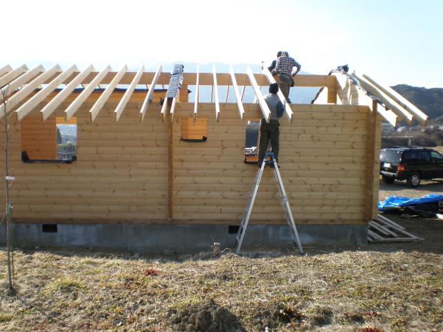 Koike-san is closest to the camera, fixing the slider assembly to the mount on the log wall. Eto-san and I are just completing the joining of the rafter pair, before attaching them to the central beam.