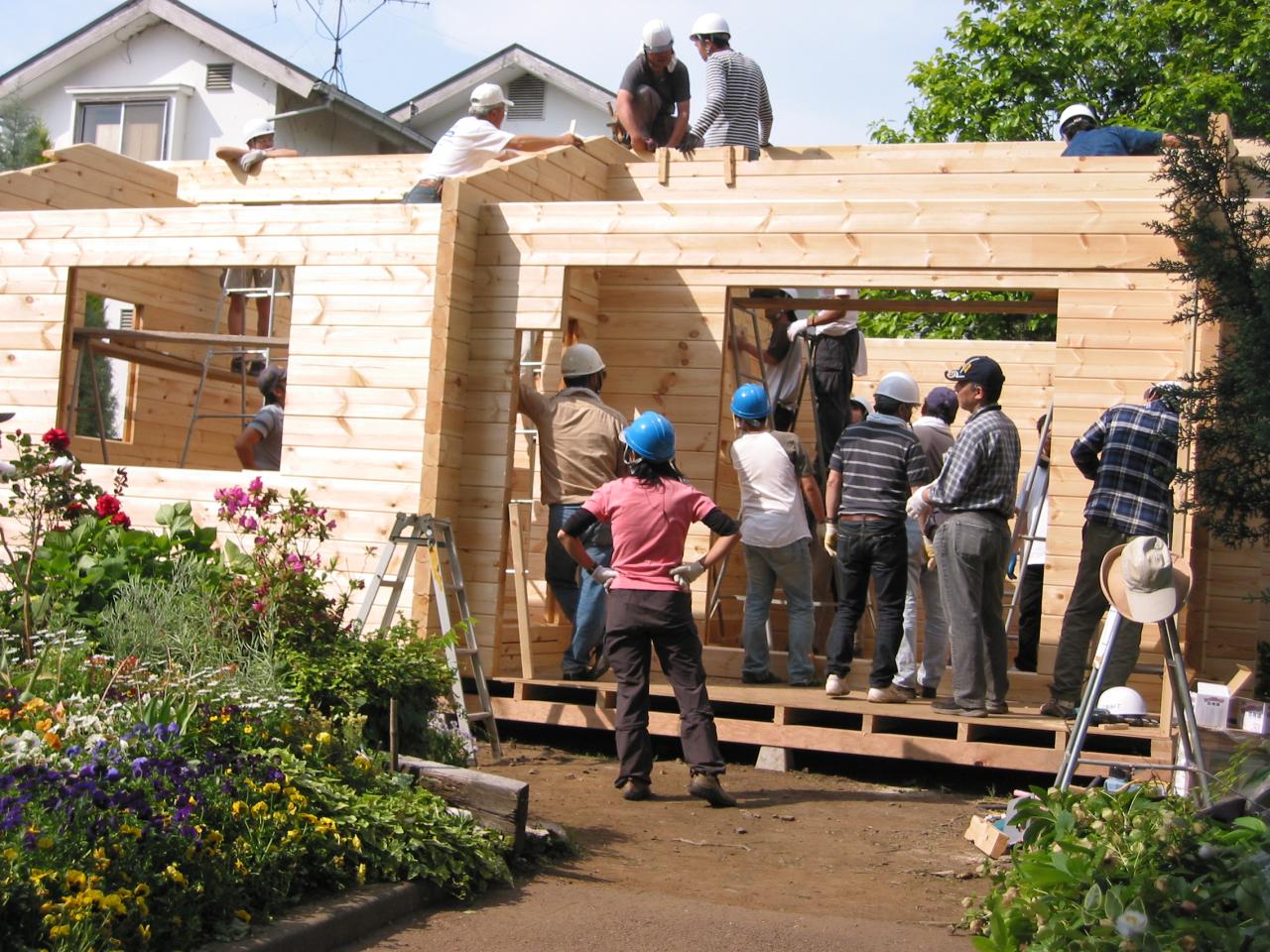 Lifters take a well-earned rest after installing the right-hand half of the centre-beam.