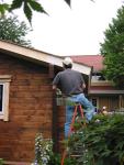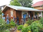The third day was the Saturday of the following weekend and, although there was a smattering of rain, the weather held fairly well and we were able to get in another full day on finishing (including staining the exterior of the log walls). We realized at the end of the last day just how much work was still left to do (the floor remained to be installed, as did the internal, sheet walls). However, I think we all left with a feeling of achievement and confident in the knowledge that we'd gained enough experience to get at least this far on our own.
